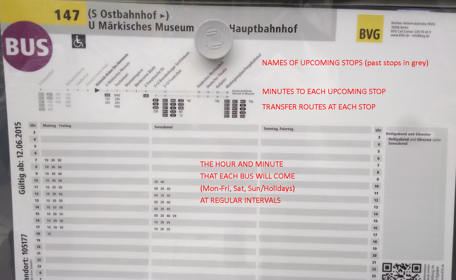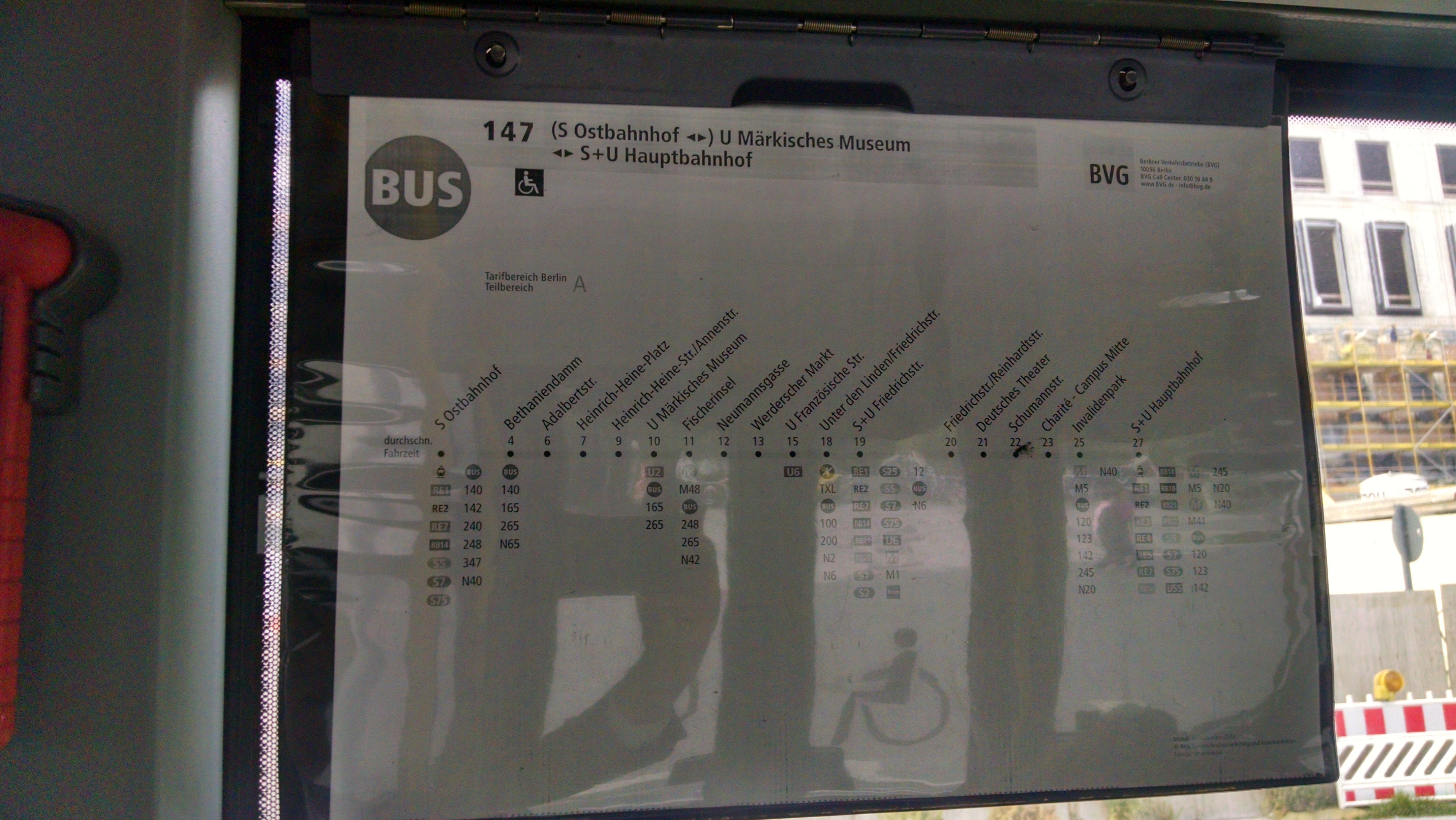 Since I just moved to Hamburg last weekend, I haven’t started with the HVV yet, so I wanted to give some impressions on customer information at bus stops from Berlin. This isn’t electronic, no apps, no computer displays (although many have them), just paper. This simple information at each stop makes it very easy to use transit in a new city, or even to use a new line if you’re already familiar with the city.